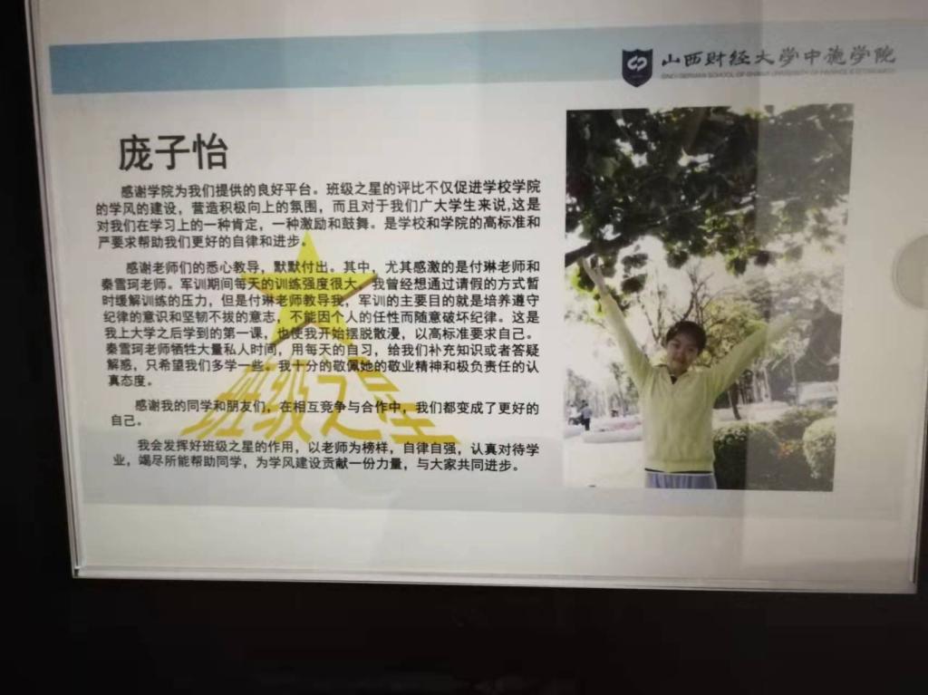 庞子怡,2018中德金融学3班学生。连续八个学期获得校级奖学金以及2018-2019,2019-2020学年专项奖学金,优秀共青团员,2021年7月加入中国共产党,2022届优秀毕业生称号。