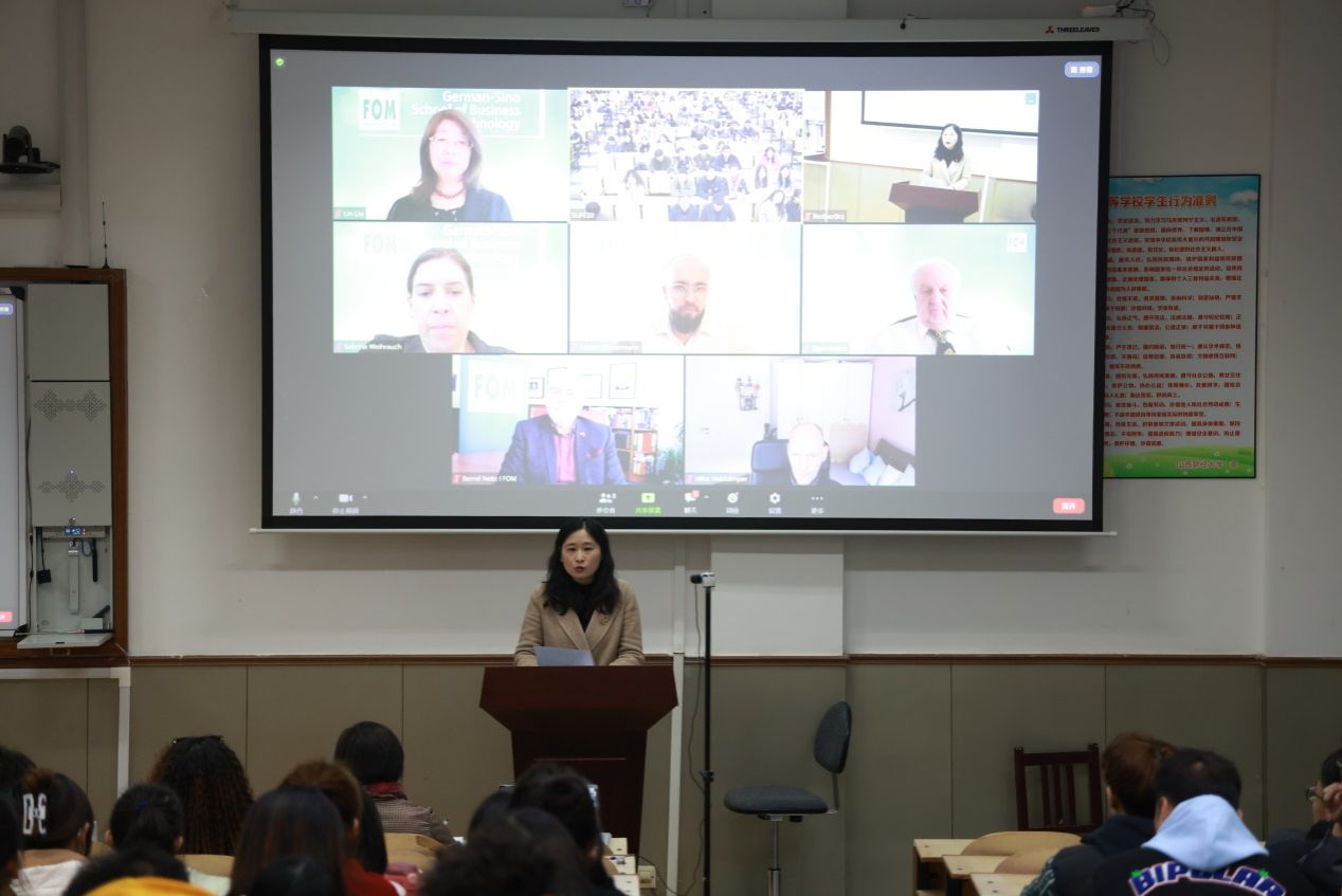 院长史贞首先代表学院讲话,她表示,虽然疫情暂时阻止了德国教授到中国的脚步,但阻挡不了各位德国教师的上课热情和同学们汲取知识的渴望。希望德国教授一如既往地发挥教书育人的崇高精神,将最先进的学习方法和最前沿的理论知识讲授给澳门正规电子游戏平台的学生们,帮助同学们完善专业知识、提高学习能力、塑造卓越人格,为进入德国FOM大学主修阶段学习奠定基础。希望同学们合理规划学习时间,优化学习方法,将专业知识的学习与德语语言的强化融会贯通,以财经类的视角去分析和规划自己的人生,做一个肩负社会责任、肩负时代使命的大学生。