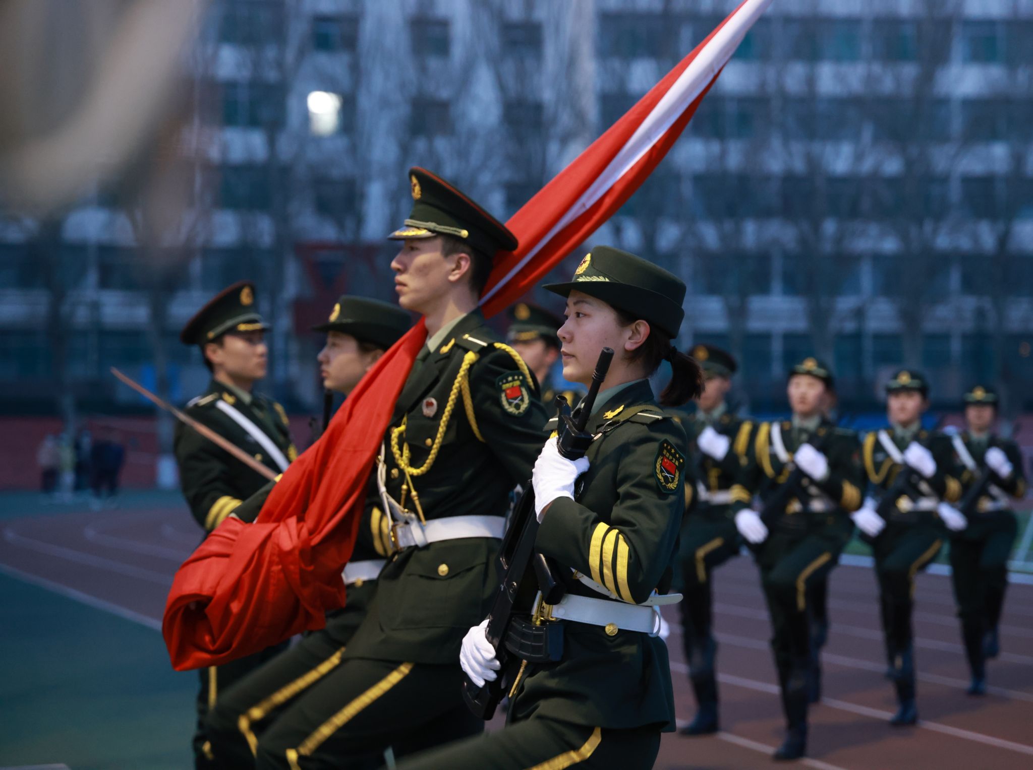 迎着春日的暖阳,感受着青春的温度,国旗班队员们身着统一服装,迈着坚定的步伐,以最饱满的热情、最昂扬的气势,守护着国旗走向国旗台。随着激昂嘹亮的《义勇军进行曲》响起,鲜艳的五星红旗在空中展开,冉冉升起。全体师生向五星红旗行注目礼,齐唱国歌,向祖国致以最崇高的敬意。