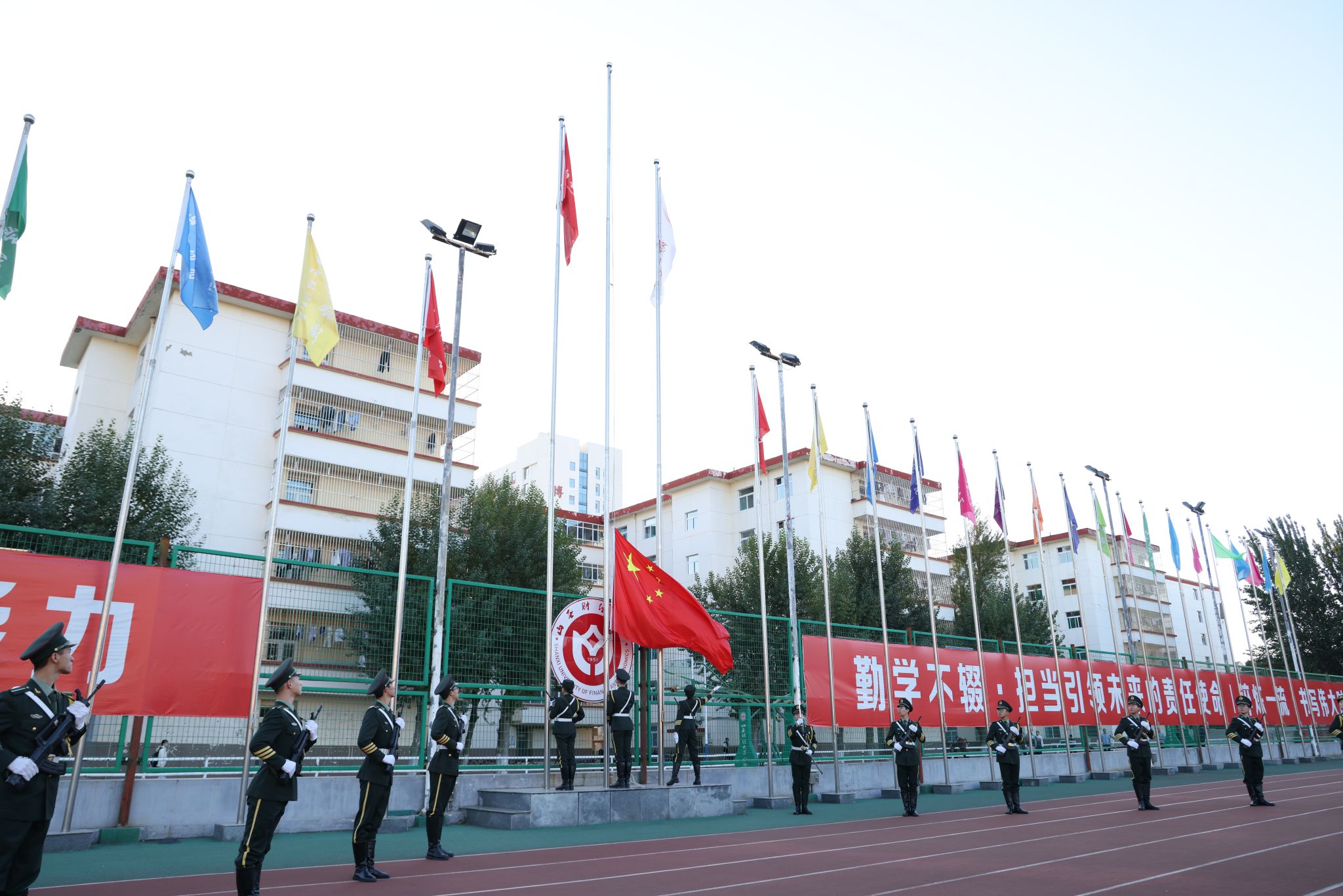 沐浴着秋日的朝阳,迈着坚定有力的步伐,国旗班队员们以最饱满的热情、最昂扬的气势,守护着国旗走向国旗台。随着激昂嘹亮的《义勇军进行曲》,五星红旗迎风招展、冉冉升起。全体师生向五星红旗行注目礼,齐唱国歌,向祖国致以最崇高的敬意。