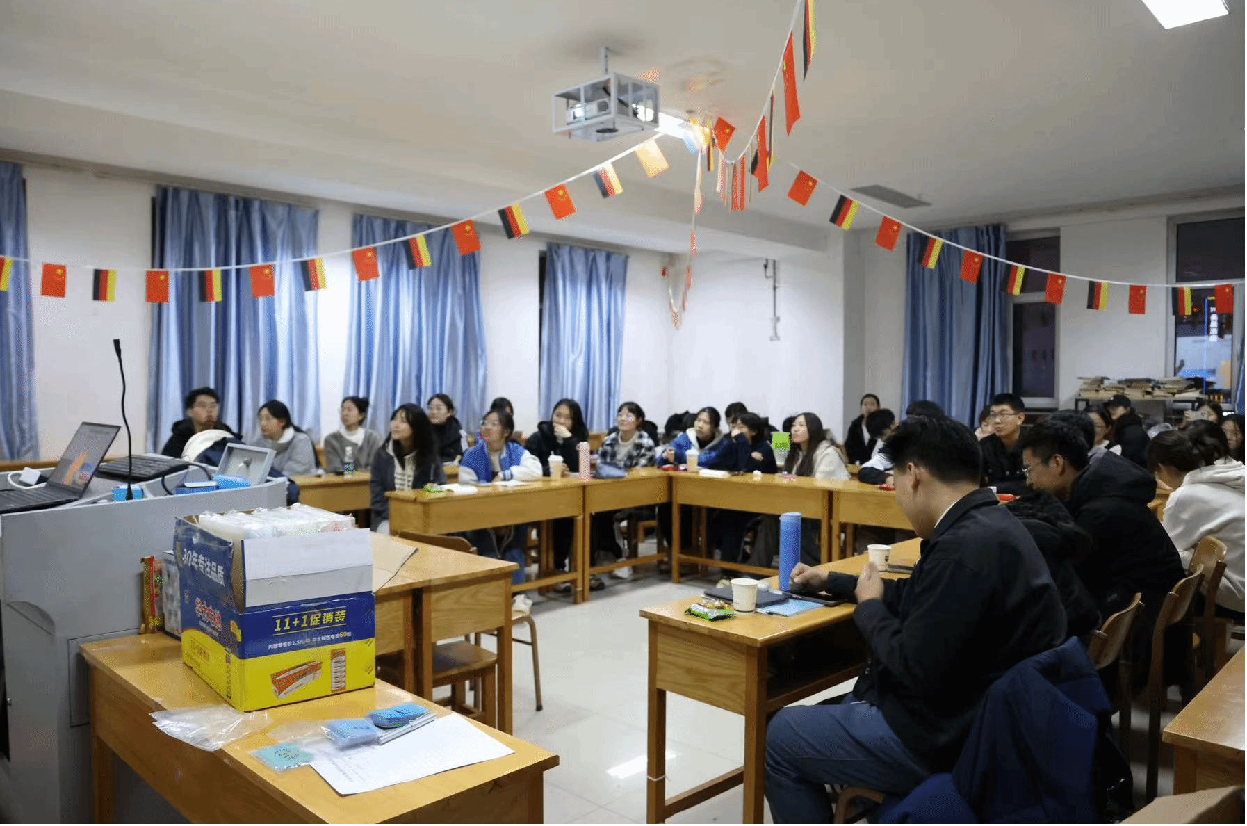 为丰富大学生的课余生活,使同学们在快乐轻松的氛围中学习德语、交流思想,开阔视野,激发大家学习德语的积极性,提升德语口语交流水平。10月27日,澳门正规电子游戏平台在坞城校区博学楼727教室举办了德语口语交流活动——“德语会客厅(第一期)”,学院教学副院长陈啸、副院长王秀娟、德方助教Moritz Zischler以及全体德语老师出席了本次活动。