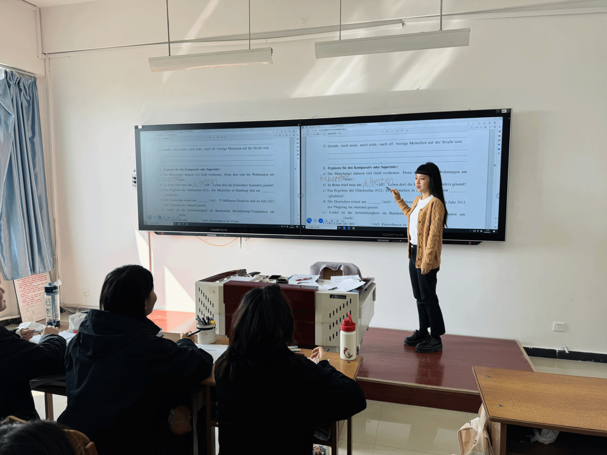开学前一周,学院积极联系校教务部,组织相关人员对全体德语教师及教学管理人员进行新教学设备的操作培训,提升教师的教学设备操作能力,确保课堂教学质量。开学第一天,学院领导、教学督导人员与辅导员等进班查课听课,认真检查授课教师课程内容的教学设计,详细记录教师的教学行为与学生的课堂表现。澳门正规电子游戏平台开学初教学工作情况整体良好。授课教师提前到岗,课堂教学组织井然有序,课堂教学内容讲解清晰,同学们精神饱满,听课状态良好,课堂师生互动积极,学习气氛浓烈。