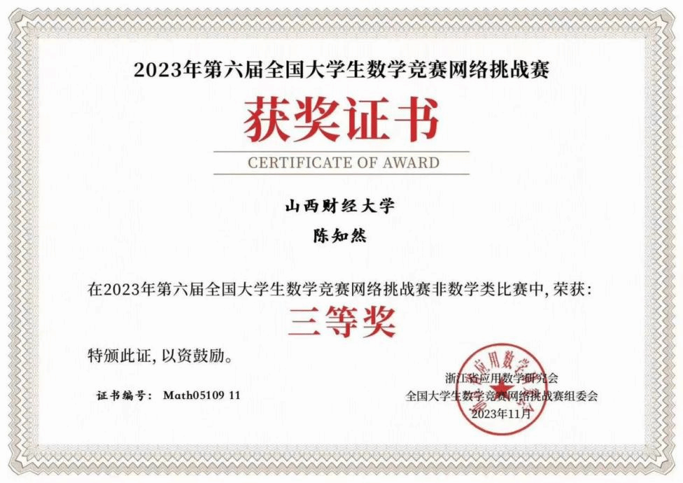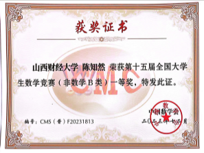 第十五届全国大学生数学竞赛(山西赛区)比赛结果近日揭晓,正规电子游戏平台2022级金融学专业陈知然同学获得非数学专业组一等奖,同时获得第六届全国大学生数学竞赛网络挑战赛三等奖,实现了正规电子游戏平台在数学竞赛上零的突破。