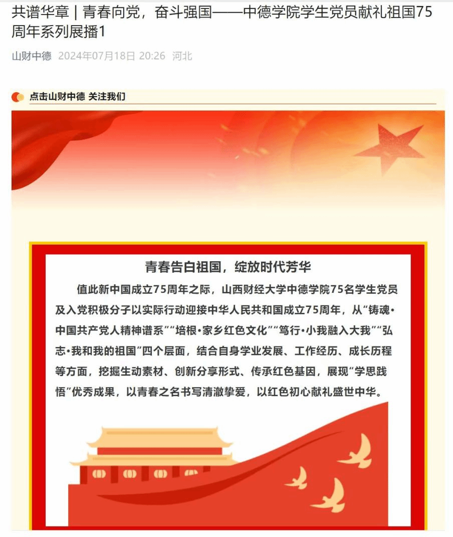 为深入学习党的二十届三中全会精神,全面贯彻落实党的教育方针,推动党史学习教育常态化长效化,引导青年学生传承红色基因、凝聚精神力量,教育中德学子讲好红色故事、传播中国声音,2024年暑期,澳门正规电子游戏平台学生党员聚焦“传承红色基因,学思践悟中国共产党人精神谱系”这一主题,结合学习和工作实际,深刻感悟伟大精神,开展专题系列推送,以实际行动庆祝新中国成立75周年。
