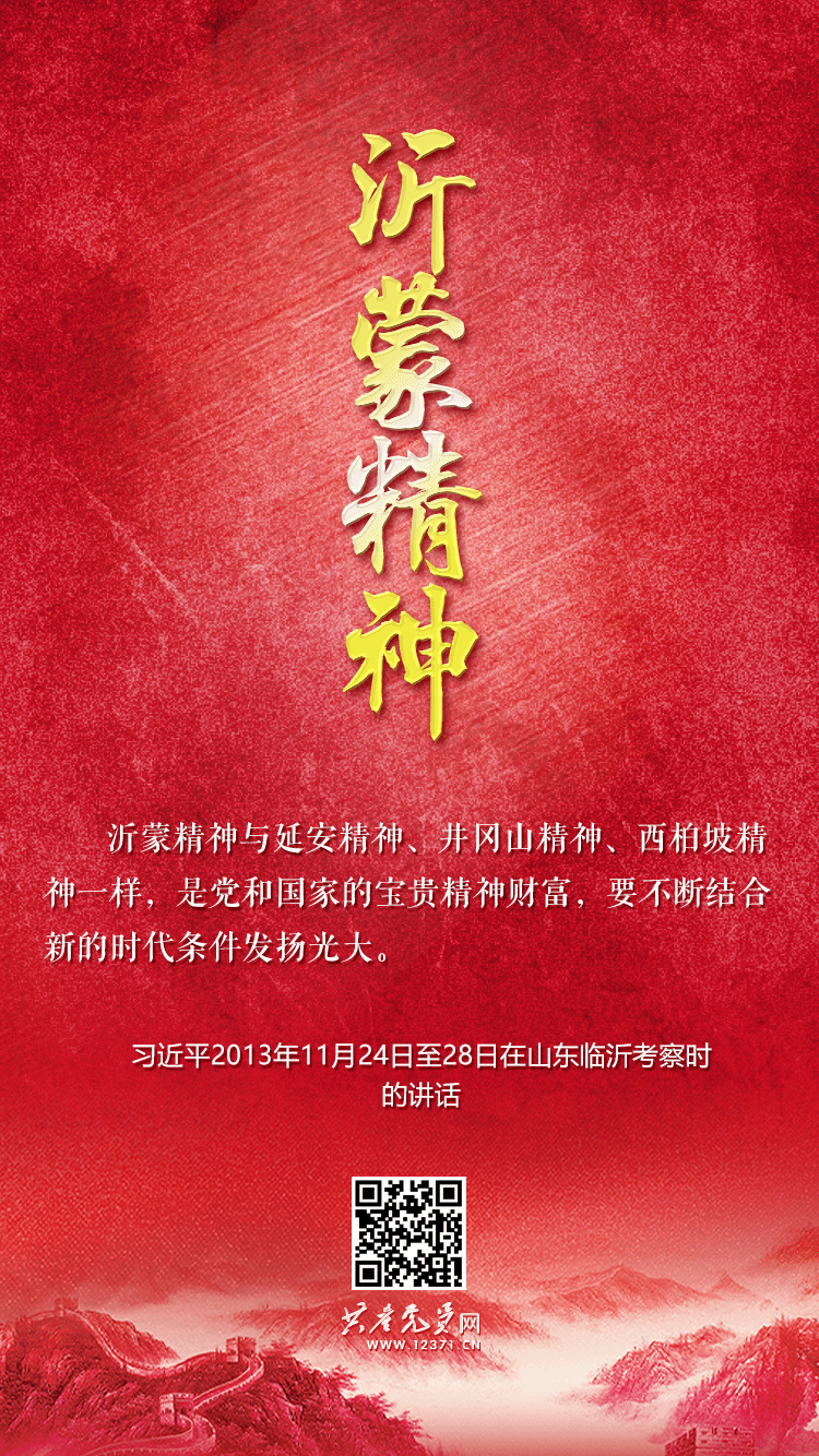2013年11月,习近平总书记在山东考察时深情地说,我一来到这里就想起了革命战争年代可歌可泣的峥嵘岁月。在沂蒙这片红色土地上,诞生了无数可歌可泣的英雄儿女,沂蒙六姐妹、沂蒙母亲、沂蒙红嫂的事迹十分感人。沂蒙精神与延安精神、井冈山精神、西柏坡精神一样,是党和国家的宝贵精神财富,要不断结合新的时代条件发扬光大。