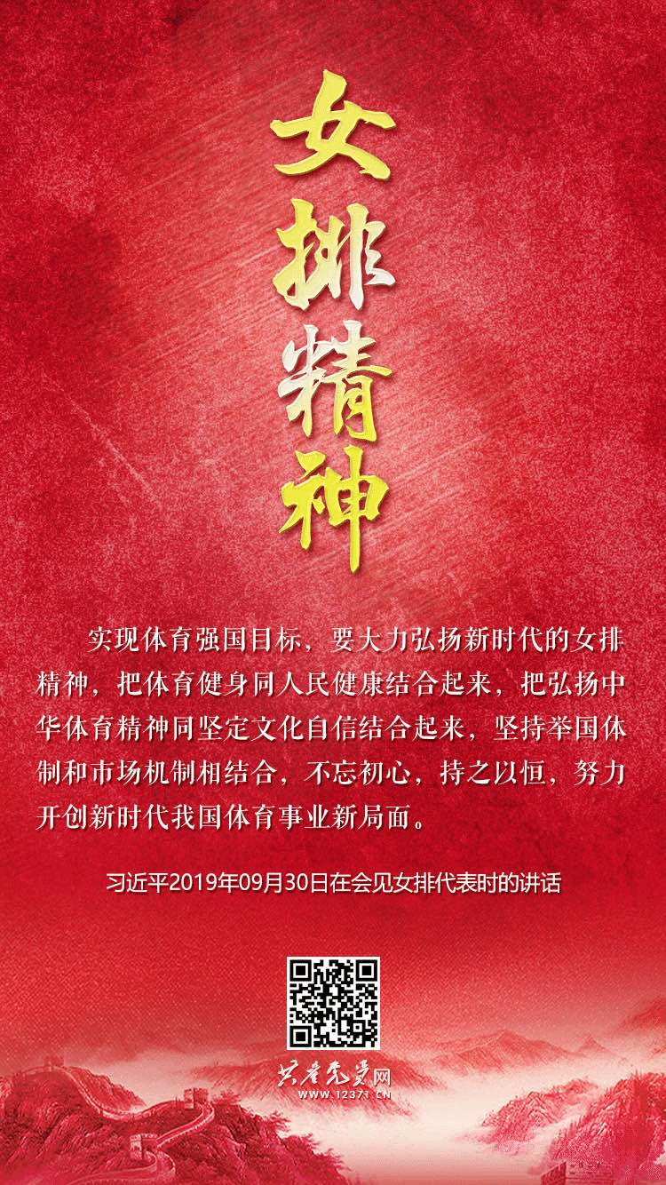 “女排精神代表着一个时代的精神,喊出了为中华崛起而拼搏的时代最强音。”40多年来,中国女排有过成功登顶的辉煌,也有过跌入低谷的挫折,但她们胜不骄、败不馁,始终葆有那么一股不服输的拼劲、打不垮的韧劲,所形成的女排精神成为中华民族的宝贵精神财富,成为中国共产党人精神谱系的重要组成部分,激励和影响着一代又一代中国人投身改革开放和中国特色社会主义伟大事业。